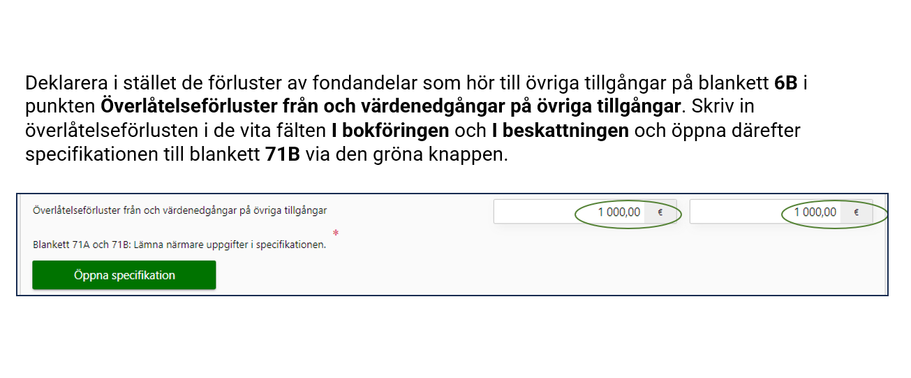 Deklarera i stället de förluster av fondandelar som hör till övriga tillgångar på blankett 6B i punkten Överlåtelseförluster från och värdenedgångar på övriga tillgångar. Skriv in överlåtelseförlusten i de vita fälten I bokföringen och I beskattningen och öppna därefter specifikationen till blankett 71B via den gröna knappen.