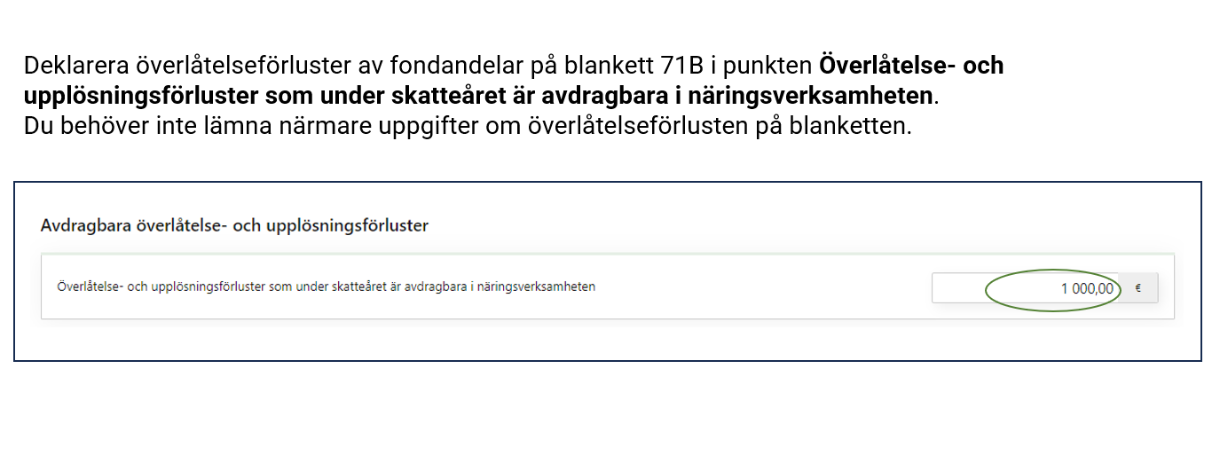 Deklarera överlåtelseförluster av fondandelar på blankett 71B i punkten Överlåtelse- och upplösningsförluster som under skatteåret är avdragbara i näringsverksamheten. Du behöver inte lämna närmare uppgifter om överlåtelseförlusten på blanketten.