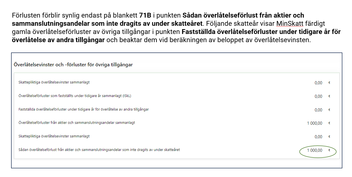 Förlusten förblir synlig endast på blankett 71B i punkten Sådan överlåtelseförlust från aktier och sammanslutningsandelar som inte dragits av under skatteåret. Följande skatteår visar MinSkatt färdigt gamla överlåtelseförluster av övriga tillgångar i punkten Fastställda överlåtelseförluster under tidigare år för överlåtelse av andra tillgångar och beaktar dem vid beräkningen av beloppet av överlåtelsevinsten.