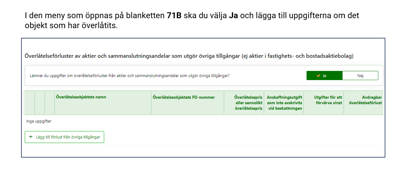 På blankett 71B öppnas en kalkyl där du ser de överlåtelsevinster som du har angett och de förluster som du har angett i den föregående punkten. I kalkylen visas också eventuella andra förluster som kan dras av från överlåtelsevinsterna av övriga tillgångar.