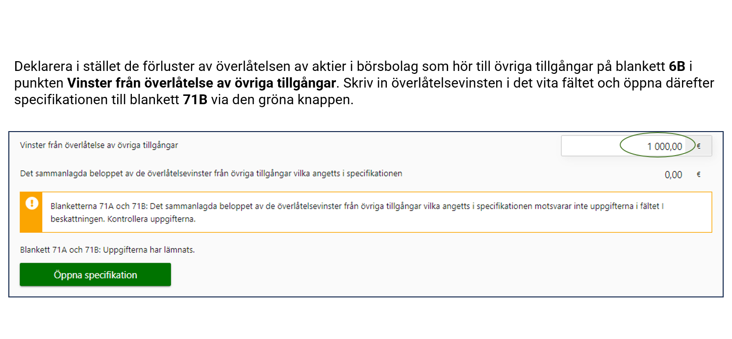 Deklarera i stället de vinster av överlåtelsen av aktier i börsbolag som hör till övriga tillgångar på blankett 6B i punkten Vinster från överlåtelse av övriga tillgångar. Skriv in överlåtelsevinsten i det vita fältet och öppna därefter specifikationen till blankett 71B via den gröna knappen.