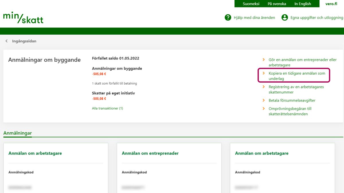 Du är på fliken Egna skatteslag. I punkten Anmälningar om byggande ska du välja länken Kopiera en tidigare anmälan som underlag.