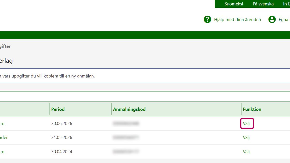 Klicka på länken Välj vid den anmälan som du vill använda som underlag för en ny anmälan.
