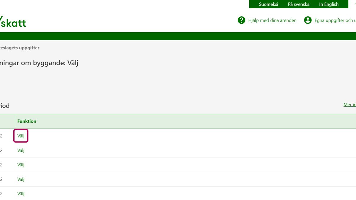 Om du får en lista över skatteperioder ska du välja den skatteperiod för vilken du nu vill lämna en anmälan. Klicka på länken Välj vid den rätta perioden.