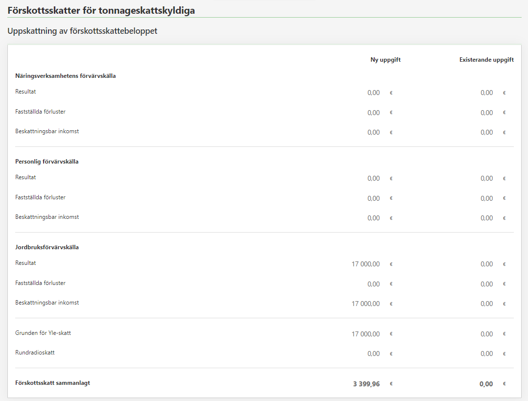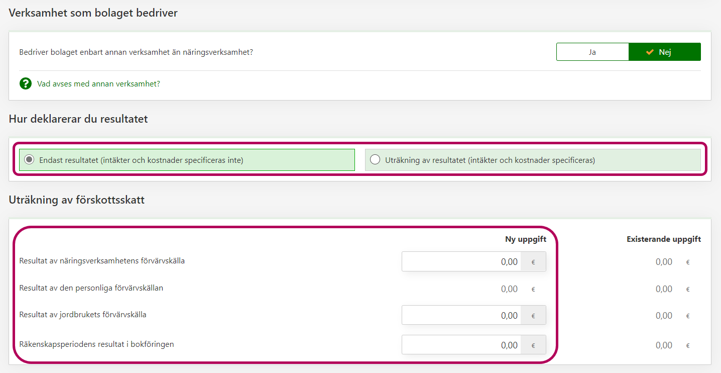Fasen Resultat: Om du ansöker om förskottsskatt för den innevarande eller följande skatteperioden, ska du välja om du anger endast resultatet eller en mer detaljerad uträkning av resultatet. Fyll i de uppgifter som behövs.