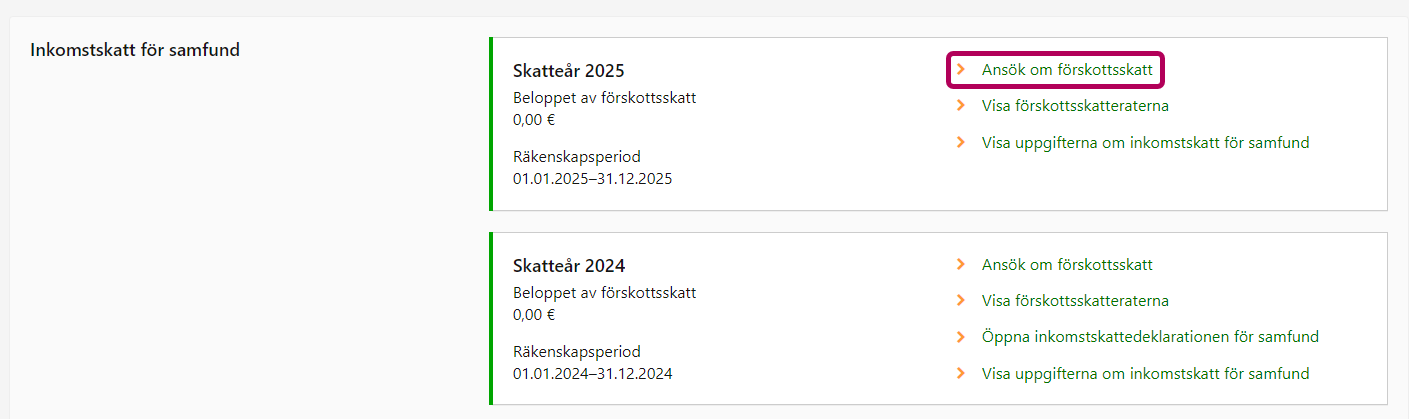 Välj i sektionen Inkomstskatt för samfund vid det rätta skatteåret länken Ansökan om förskottsskatt.