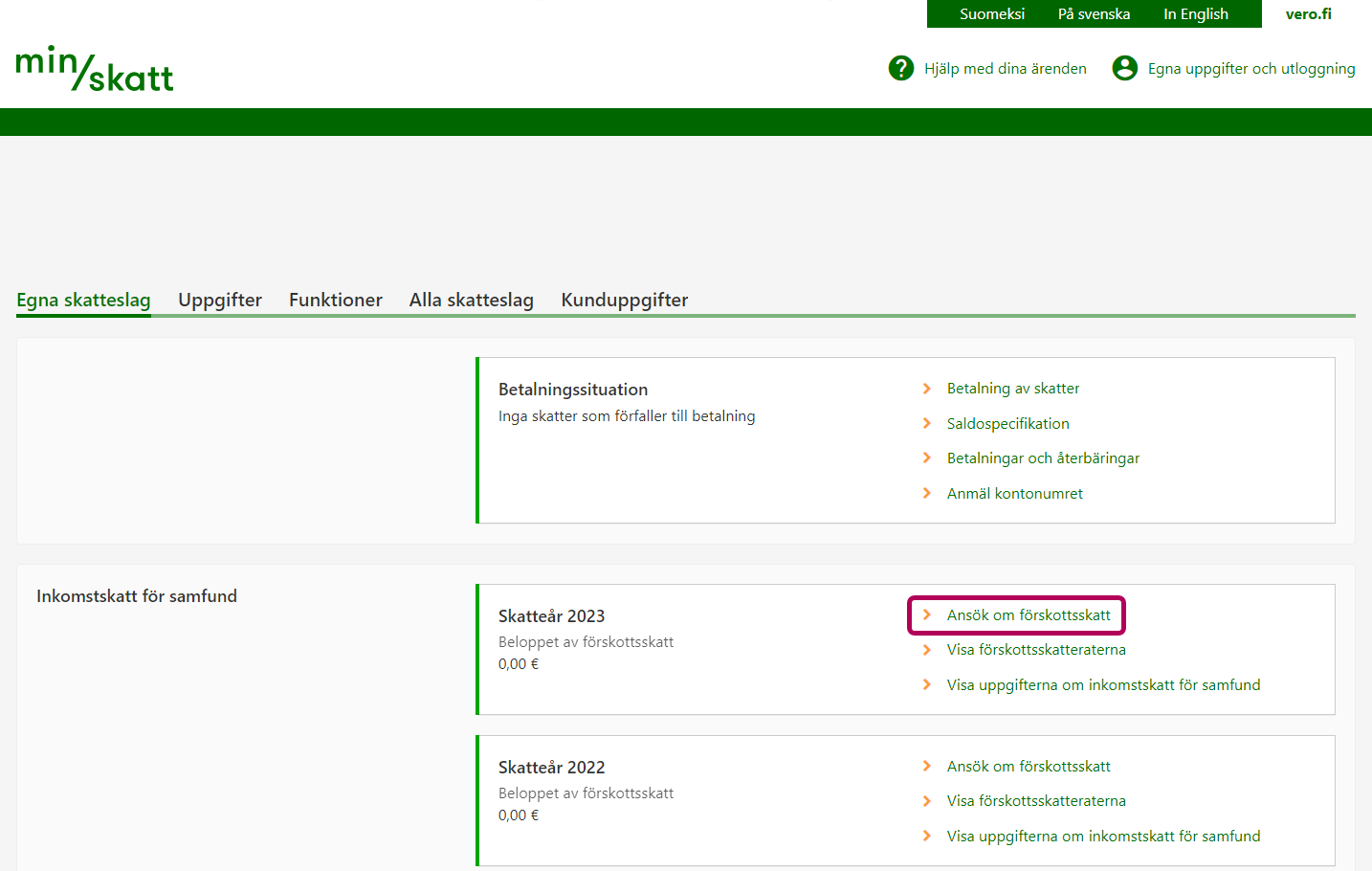 Välj i sektionen Inkomstskatt för samfund vid det rätta skatteåret länken Ansökan om förskottsskatt.