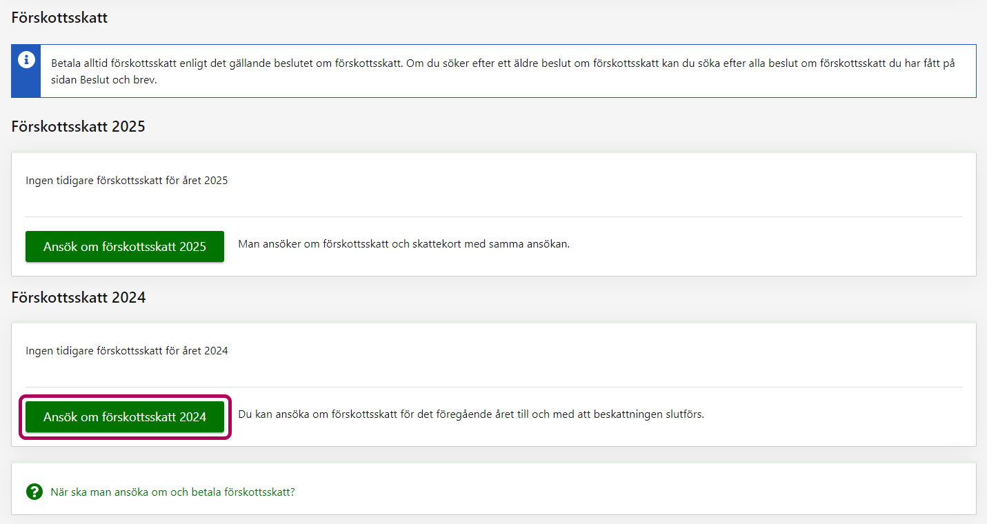 Rulla till slutet av sidan. Välj i punkten Förskottsskatt 2025 länken Ändra förskottsskatten eller Ansök om förskottsskatt.
