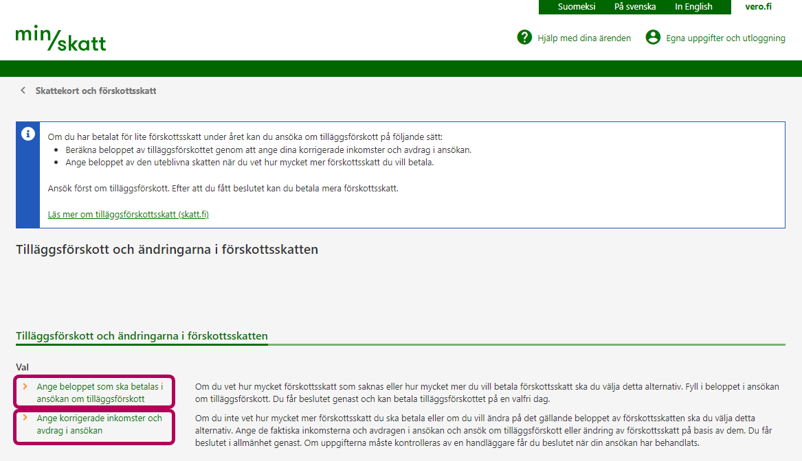 Fasen Beloppet av förskottsskatt: Du ser direkt i MinSkatt det belopp av tilläggsförskott som ska betalas.