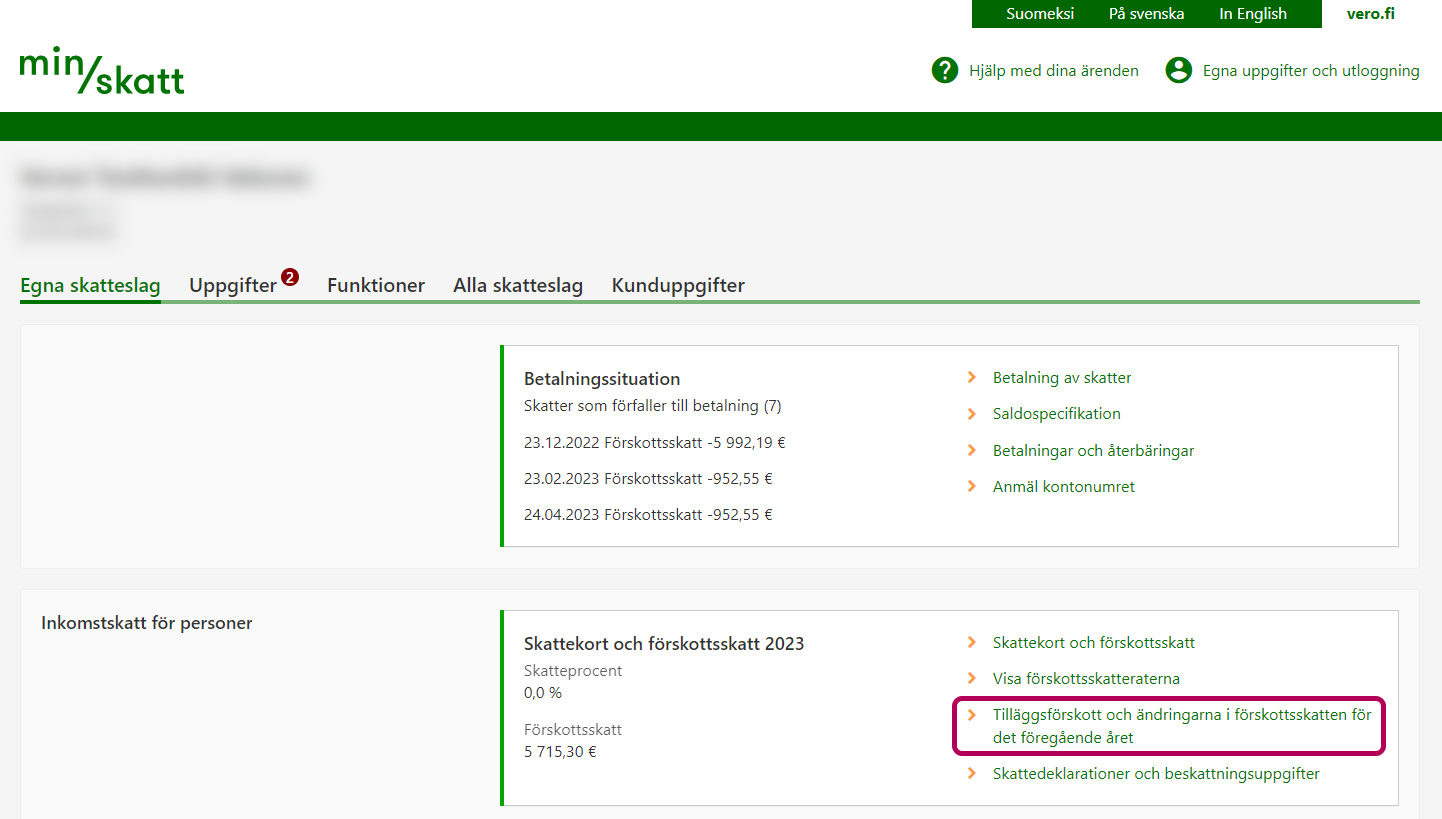 Fasen Beloppet av förskottsskatt: Du ser direkt i MinSkatt det belopp av tilläggsförskott som ska betalas.
