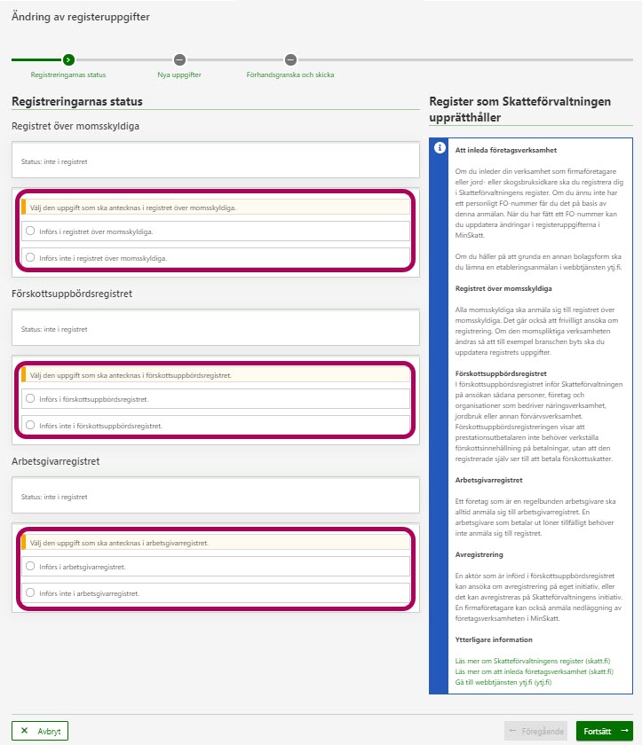 Välj på sidan de register som du vill ansluta dig till. Markera vid varje register om du vill ansluta dig till registret eller inte. Gå från sidans nedre kant till den följande sidan.
