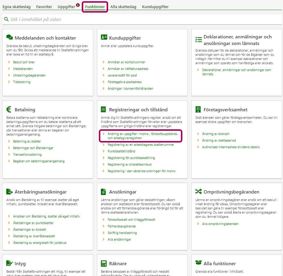 Gå till MinSkatt och där till fliken Kunduppgifter och välj sedan punkten Ändra registeruppgifter. På ingångssidan kan du även välja fliken Skatteärenden och där i punkten Registreringar och tillstånd välja Ändring av uppgifter i moms-, förskottsuppbörds- och arbetsgivarregistren.