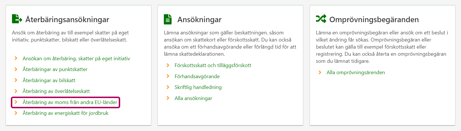 2. Rulla neråt till punkten Återbäringsansökningar. Välj länken Återbäring av moms från andra EU-länder.