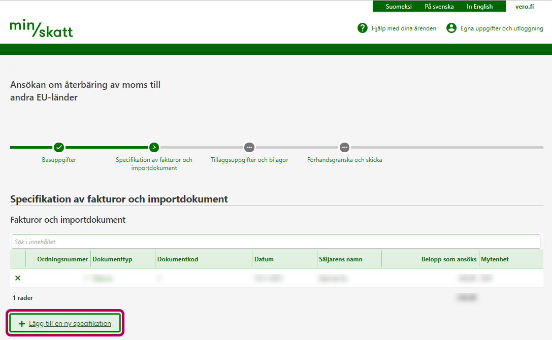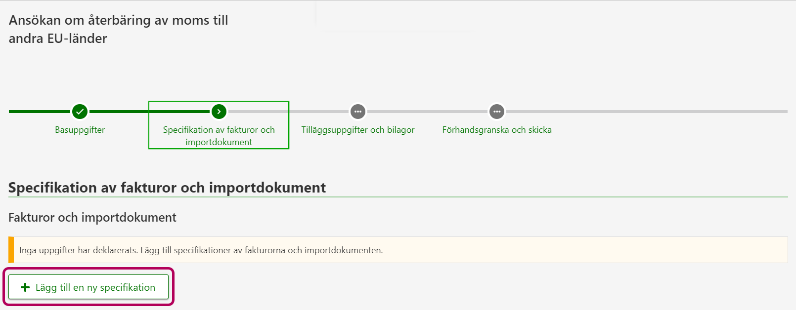 5. Du kan lägga till nya fakturor och importdokument via länken Lägg till en ny specifikation. När du har lagt till alla specifikationer ska du gå vidare till fasen Tilläggsuppgifter och bilagor.