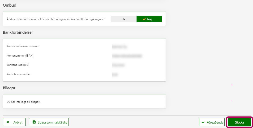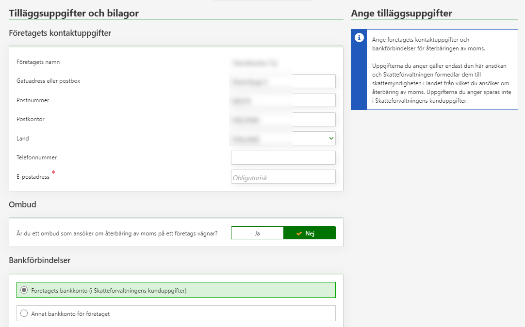 6. Ange företagets kontaktuppgifter och uppgiften om bankförbindelsen. Om du är ett ombud ska du lägga till dina kontaktuppgifter. Lägg till bilagor enligt behov. Gå till följande fas som är Förhandsgranska och skicka.