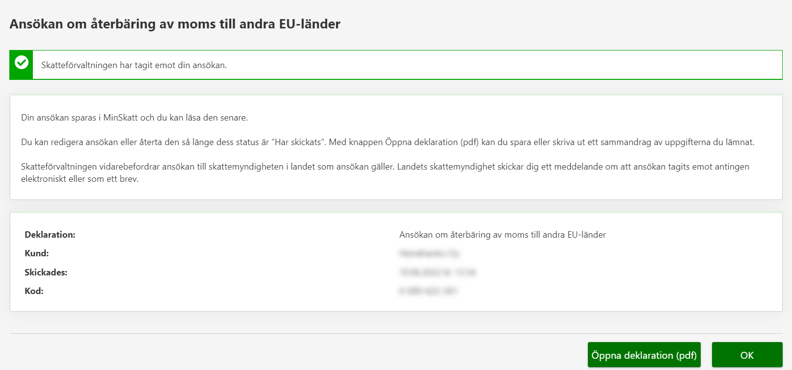 8. 8. Observera, att du får två separata mottagningsbekräftelser på din ansökan. Den första bekräftelsen genast efter att du har skickat ansökan i MinSkatt. Och den andra egentliga bekräftelsen från det land där du har ansökt om återbäring.