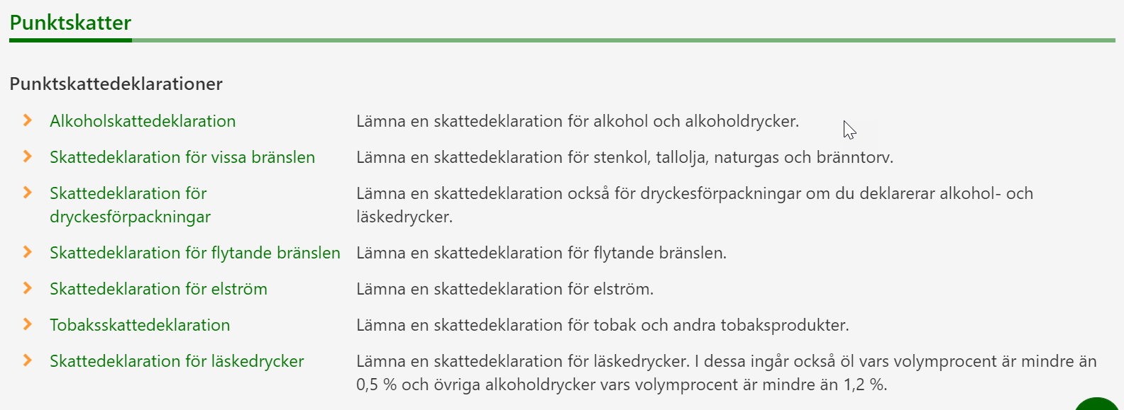 3. Välj i punkten Punktskattedeklarationer den punktskatt som deklarationen gäller.