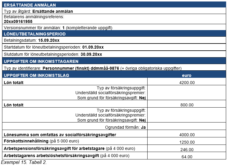 Exempel 4 (Korrigeringar som gjorts många gånger för samma anmälan): En inkomsttagare har i lön fått 2 000 euro, och i detta belopp ingår en tidlön på 1 500 euro, en övertidsersättning på 360 euro och en kvällsarbetsersättning på 140 euro. Prestationsbetalaren uppger av misstag kvällsarbetsersättningen som kvällsskiftestillägg.
