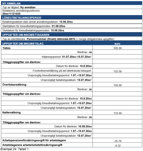 Exempel 26 (Beloppet har under flera löneperioder betalats till inkomsttagaren): Under sex månader (i löneutbetalningen februari–juli) har utöver den normala lönen (2 550 euro) ett språktillägg på 200 euro per månad betalats till inkomsttagaren. Inkomsttagarens lön uppgick till sammanlagt 2 750 euro. I slutet av juli upptäcker man att inkomsttagaren inte haft rätt till ett språktillägg.