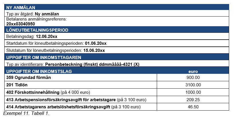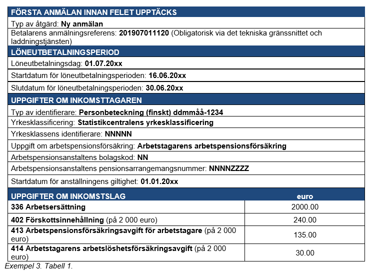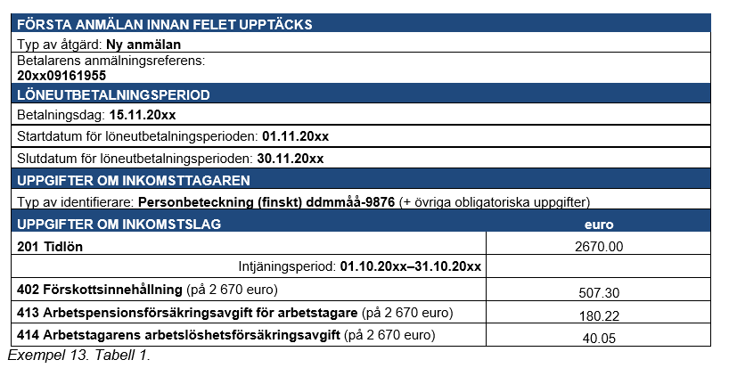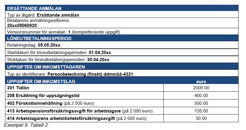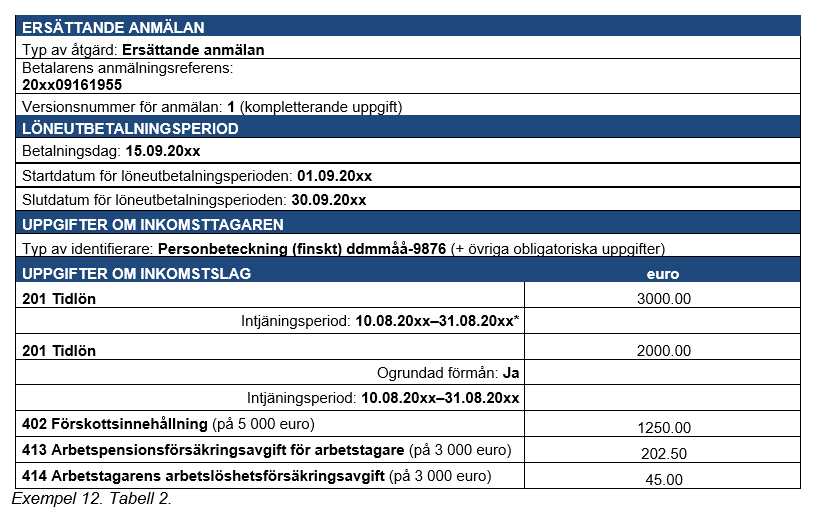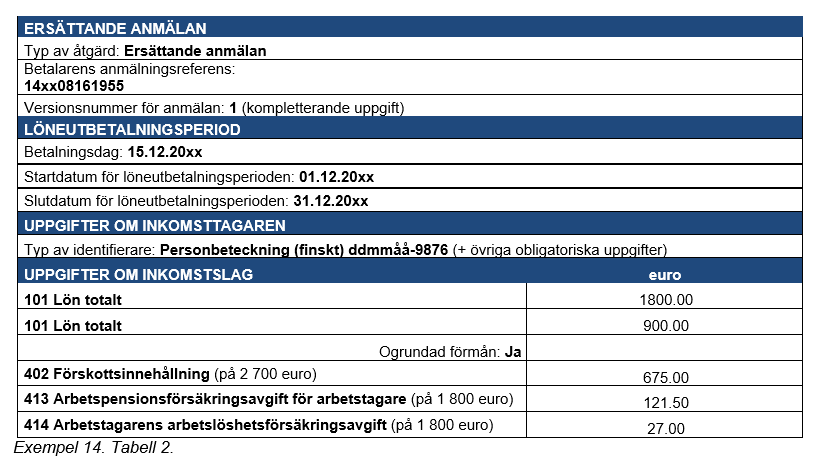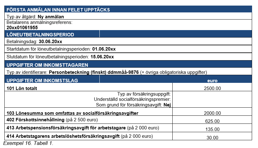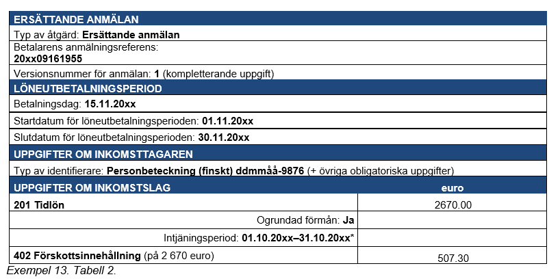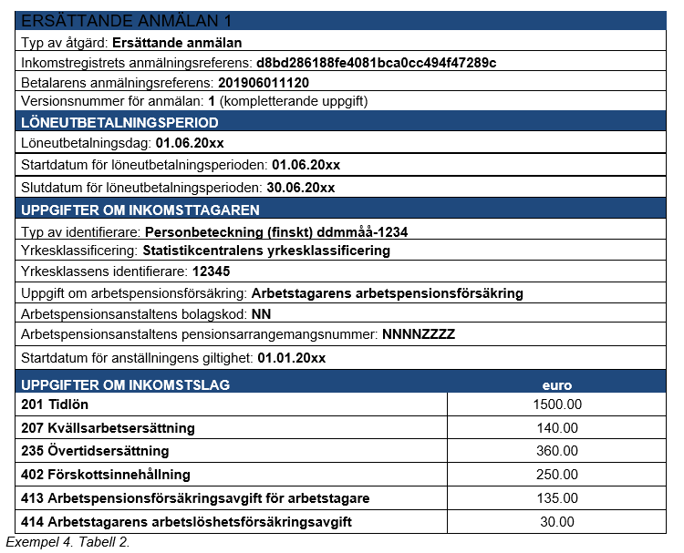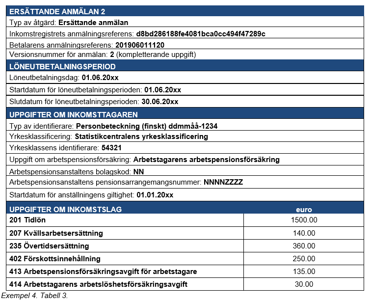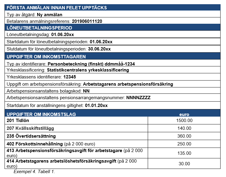 Exempel 4 (Korrigeringar som gjorts många gånger för samma anmälan): En inkomsttagare har i lön fått 2 000 euro, och i detta belopp ingår en tidlön på 1 500 euro, en övertidsersättning på 360 euro och en kvällsarbetsersättning på 140 euro. Prestationsbetalaren uppger av misstag kvällsarbetsersättningen som kvällsskiftstillägg.