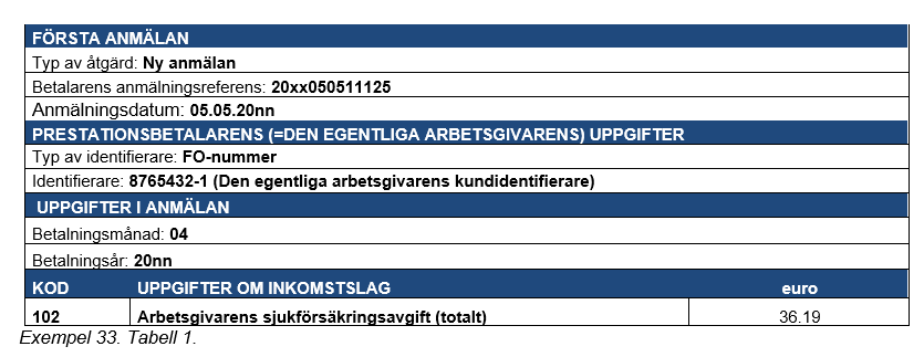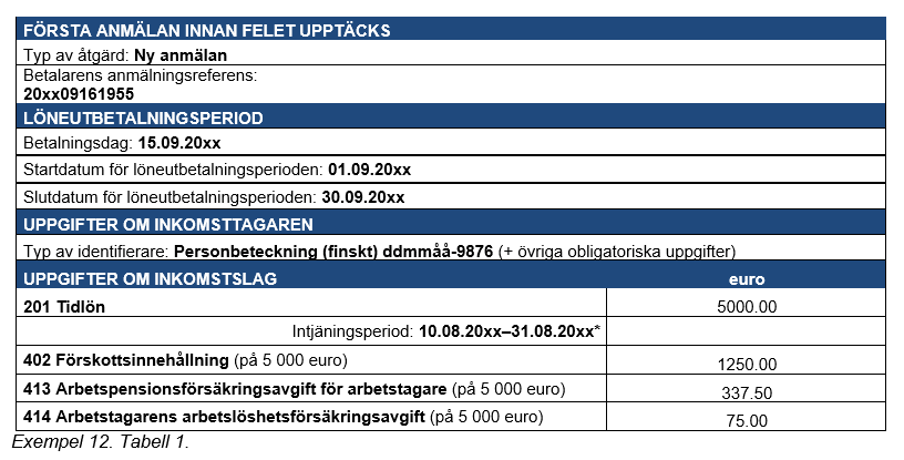 Exempel 34 (Anmälan om löneuppgifter korrigeras, och av denna anledning måste också den tidigare inlämnade arbetsgivarens separata anmälan korrigeras): Till en inkomsttagare har 5 000 euro betalats. Prestationsbetalaren har med anmälan om löneuppgifter anmält lönen och med arbetsgivares separata anmälan gett uppgifterna om beloppet av sjukförsäkringsavgiften på motsvarande sätt.