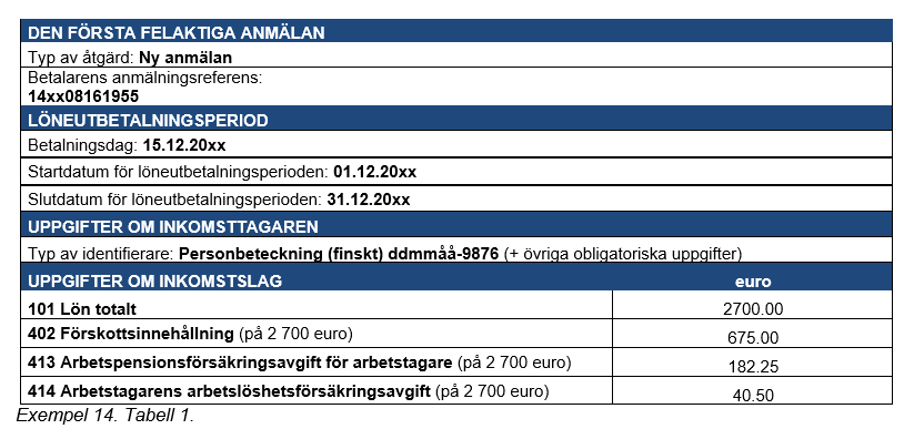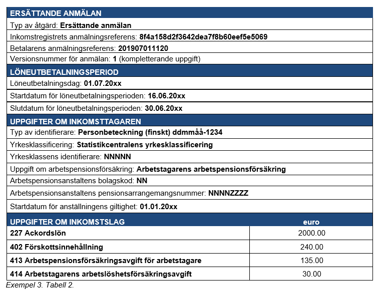 Exempel 3 (Inkomsten har anmälts med fel inkomstslag): En ackordslön på 2 000 euro har betalats till en inkomsttagare, och på denna har betalaren verkställt förskottsinnehållning (240 euro) och debiterat arbetstagarens socialförsäkringspremier.