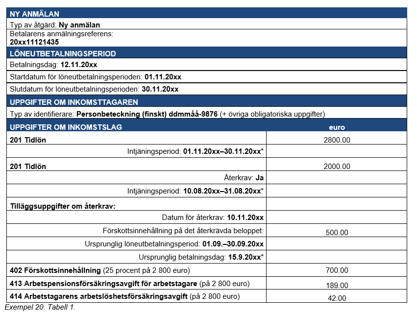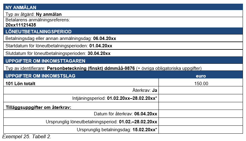Exempel 30 (Ogrundad förmån och återkrav i samma anmälan). Till en inkomsttagare har 3 000 euro betalats i lön. Prestationsbetalaren verkställer förskottsinnehållning (20 procent) på inkomsten. I samma löneutbetalning har man av inkomsttagaren återkrävt en överbetalning på 150 euro som gjorts i samband med föregående löneutbetalning. Prestationen återkrävs till bruttobeloppet. Uppgifterna har anmälts till inkomstregistret som normalt.