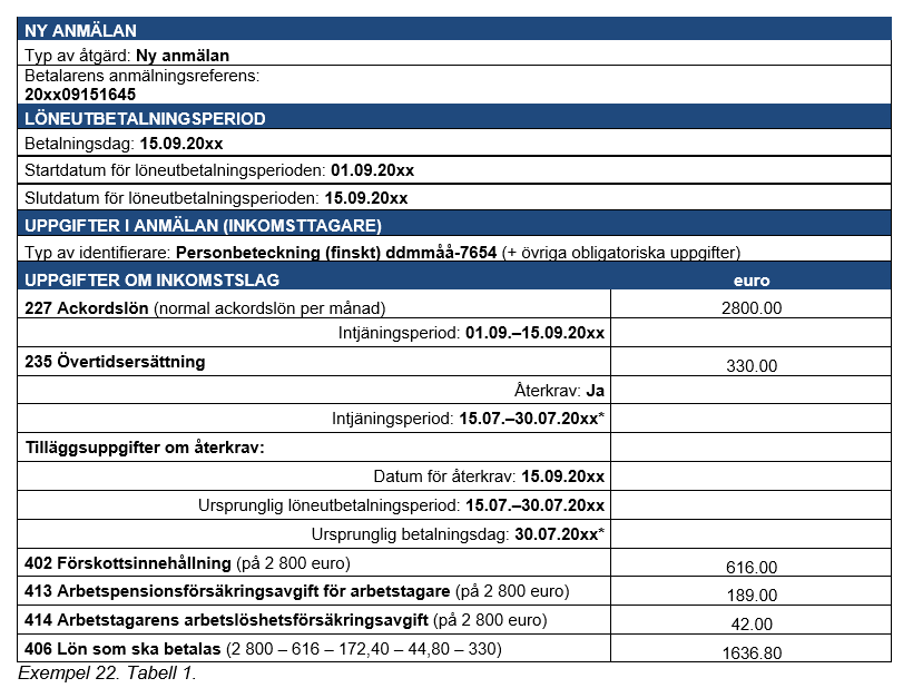 Exempel 26 (Beloppet har under flera löneperioder betalats till inkomsttagaren): Under sex månader (i löneutbetalningen februari–juli) har utöver den normala lönen (2 550 euro) ett språktillägg på 200 euro per månad betalats till inkomsttagaren. Inkomsttagarens lön uppgick till sammanlagt 2 750 euro. I slutet av juli upptäcker man att inkomsttagaren inte haft rätt till ett språktillägg.