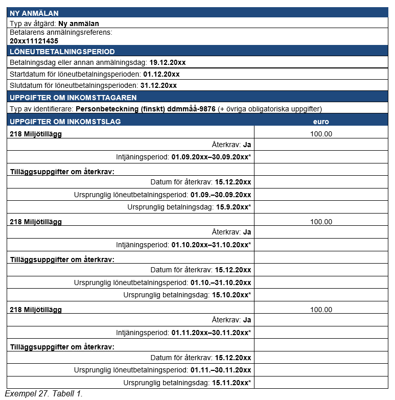 Exempel 27 (En prestation som betalats i flera rater och som återkrävs på en gång): Under tre månader (september–november) har ett månatligt flotationstillägg på 100 euro betalats till en inkomsttagare. Inkomsten har med inkomstslaget Miljötillägg anmälts till inkomstregistret. Senare lägger man märke till att inkomsttagaren inte hade rätt till det aktuella tillägget.