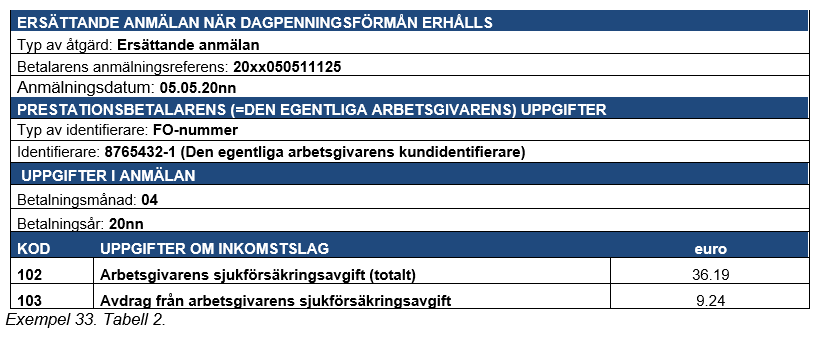 I exempel 31 ska prestationsbetalaren dessutom korrigera det totala beloppet av arbetsgivarens sjukförsäkringsavgift med arbetsgivarens separata anmälan, om beloppet av sjukförsäkringsavgiften förändras på grund av korrigeringen av anmälan om löneuppgifter.