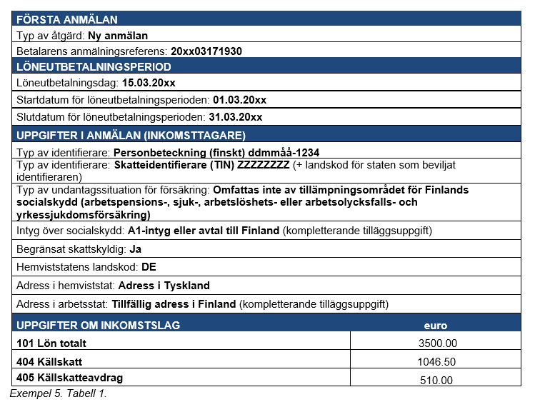Exempel 5 (Inkomsttagarens skattemässiga ställning förändras): En i Tyskland bosatt begränsat skattskyldig person arbetar i Finland 01.01–31.03 i en finländsk arbetsgivares tjänst. Arbetstagaren har ett A1-intyg, dvs. hen är försäkrad i sin hemviststat. Källskatteavdraget på inkomsttagarens källskattekort är 510 euro. Arbetsgivaren betalar 3 500 euro i månadslön till personen och uppbär en källskatt på 35 procent, dvs. 1 046,50 euro.