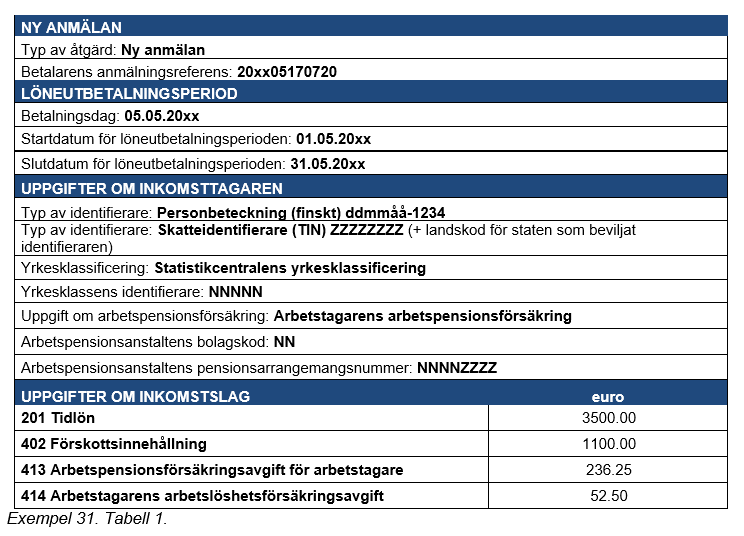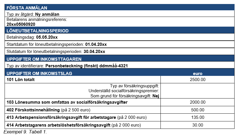 Exempel 32 (Korrigering av uppgiften Undantagssituation för försäkring): En utländsk arbetstagare arbetar i Finland ett år (15.4.20n1–14.4.20n2) för en finländsk arbetsgivare. Månadslönen är 4 600 euro. Lön för den första löneperioden har hunnit utbetalas till arbetstagaren innan hen retroaktivt får intyget över utsända arbetstagare från sin hemviststat. Intyget stod inte till förfogande i samband med den första löneutbetalningen, och därför var betalaren tvungen att betala socialförsäkringspremier på lönen till arbetstagaren och även uppge övriga uppgifter som informationsanvändarna behöver om arbetstagaren.