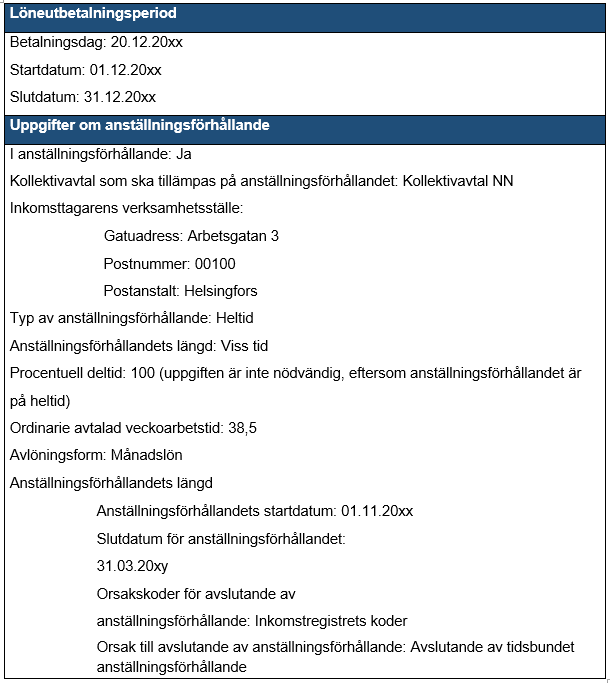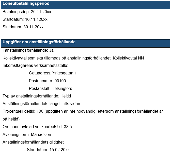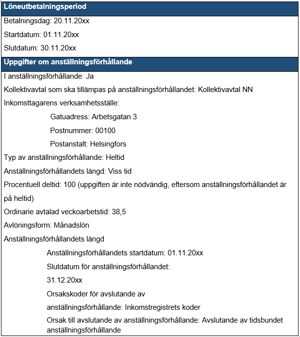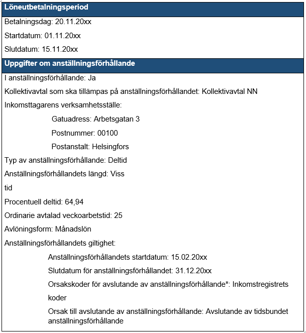 Anställningsförhållandet för en inkomsttagare är under löneutbetalningsperioden 1–30.11.20xx till en början en deltidsanställning som är tidsbunden. Deltidsprocenten är 64,94, då den arbetstid som ska tillämpas för en heltidsanställd är 38,5 timmar inom branschen. Följaktligen är den ordinarie veckoarbetstiden för deltidsarbete 25 timmar. Avlöningsformen är månadslön. Anställningsförhållandet började 15.2.20xx och visstidsanställningen upphör 31.12.20xx. Löneutbetalningsdagen är den 20:e i månaden.