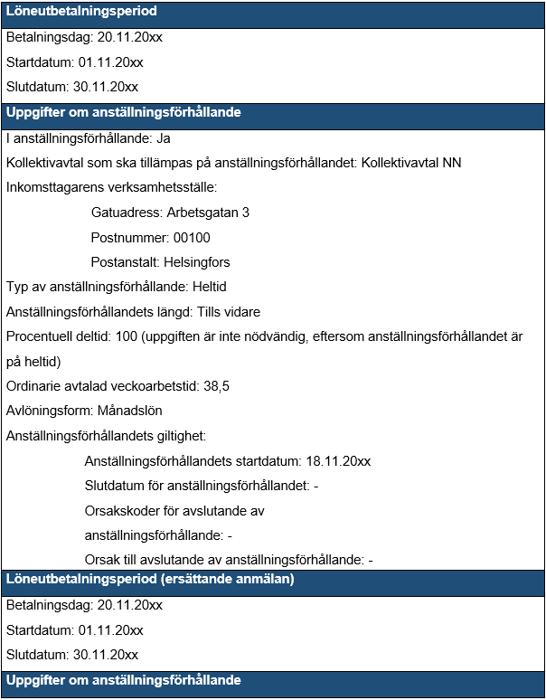 I första hand rekommenderas det att använda det ovan beskrivna anmälningssättet där två olika anmälningar ges (till exempel för tiden för visstidsanställning och heltidsanställning) och lönerna anmäls för olika löneutbetalningsperioder. Om detta inte är möjligt, kan två anmälningar ges: i den första anmäls alla löner och anställningsförhållandets uppgifter från början av löneperioden och i den andra anmäls enbart uppgifterna om anställningsförhållandet från och med ändringen (antalet anmälningar kan vara flera, till exempel om en inkomsttagare kallas in till arbete vid behov eller om antalet anställningsförhållanden är flera). Om inte heller detta anmälningssätt är möjligt, kan uppgifterna om löneutbetalningsperioden anmälas med uppgifterna från utbetalningsdagen eller den sista dagen av löneutbetalningsperioden. I så fall är innehållet i anmälan om löneuppgifter för hela den löneutbetalningsperiod som utgörs av november månad (1–30.11.20xx) förenligt med anmälan 2 ovan.