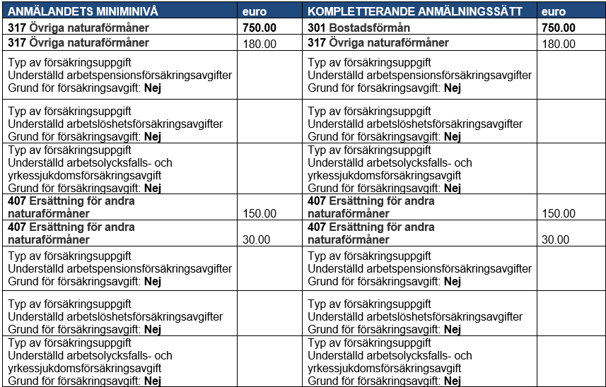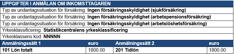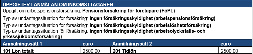 Exempel 7: Om en inkomsttagare inte omfattas av det finländska socialskyddet enbart vad gäller arbetspensionsförsäkring, ska information ges i varje anmälan i Typen av undantagssituation för försäkring i punkten Övriga försäkringsuppgifter, där det värde som ska ges är ”Omfattas inte av tillämpningsområdet för Finlands socialskydd (arbetspensionsförsäkring)”.