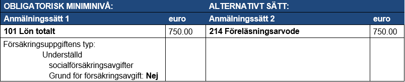 Exempel 2: En inkomsttagare har föreläst på ett evenemang som ordnats av ett privat utbildningsföretag. Inkomsttagaren är inte anställd av utbildningsföretaget. Det avtalade föreläsningsarvodet är 750 euro. I inkomstslaget Föreläsningsarvode enligt anmälningssätt 2 är det förvalt att inkomsten inte är underställd socialförsäkringsavgifter. Eftersom mottagaren av föreläsningsarvodet i detta fall inte står i anställningsförhållande till betalaren och det handlar om en betalare som omfattas av ArPL-försäkring, är arvodet inte underställd socialförsäkringsavgifter (arbetspensionsförsäkringsavgift, arbetslöshetsförsäkrings- och sjukförsäkringspremie och inte heller arbetsolycksfalls- och yrkessjukdomsförsäkring.)