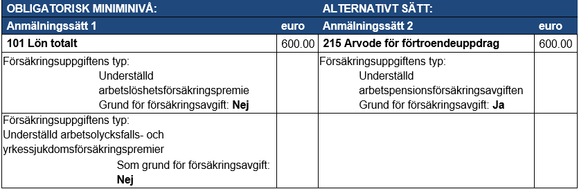 Exempel 3: Ett arvode för förtroendeuppdrag på 600 euro betalas ut till en inkomsttagare. Det förvalda värdet för inkomstslaget Arvode för förtroendeuppdrag enligt anmälningssätt 2 är att det inte är underställd pensions-, arbetslöshets- eller arbetsolycksfalls- och yrkessjukdomsförsäkringspremier. Däremot är inkomstslaget underställd sjukförsäkringsavgifter.