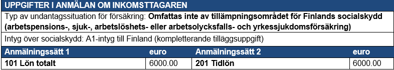 På basis av de angivna uppgifterna fastställs inga finländska socialförsäkringsavgifter utifrån arbetstagarens inkomst.