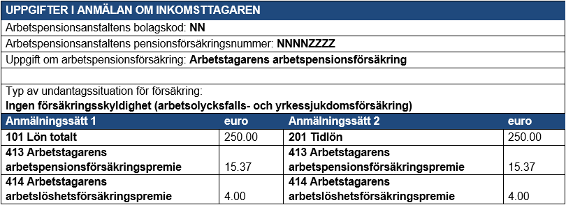 I så fall anmäls inte heller uppgifter om arbetspensionsförsäkring, såsom arbetspensionsanstaltens bolagskod eller pensionsarrangemangsnummer.