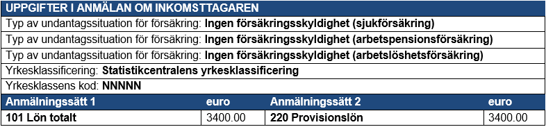 Exempel 7: Om en inkomsttagare inte omfattas av det finländska socialskyddet enbart vad gäller arbetspensionsförsäkring, ska information ges i varje anmälan i Typen av undantagssituation för försäkring i punkten Övriga försäkringsuppgifter, där det värde som ska ges är ”Omfattas inte av tillämpningsområdet för Finlands socialskydd (arbetspensionsförsäkring)”.