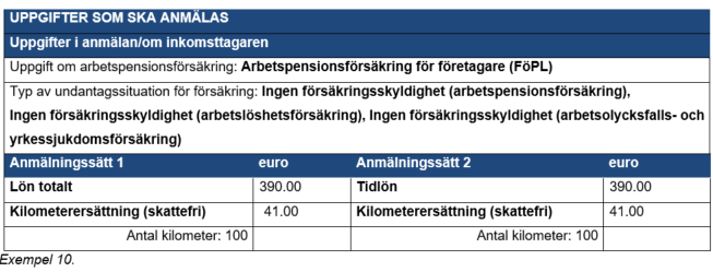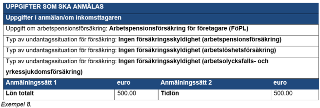 I exemplen i anvisningen beskrivs anmälningen av uppgifter såväl som ett totalt belopp som med specifikationer. I exempel visas inte alla uppgifter som är obligatoriska att lämna in, utan enbart de uppgifter som är nödvändiga att anmäla i de specialsituationer som beskrivs i denna anvisning. Det finns inte separata anvisningar om anmälning av till exempel förskottsinnehållning. De penningbelopp som använts i exemplen är av exempelkaraktär och beloppet av socialförsäkringsavgifterna, förskottsinnehållningsprocenten och de skattefria kostnadsersättningarna ska ses över årligen. Förskottsinnehållningen fastställs utifrån en förskottsinnehållningsprocent enligt mottagare.