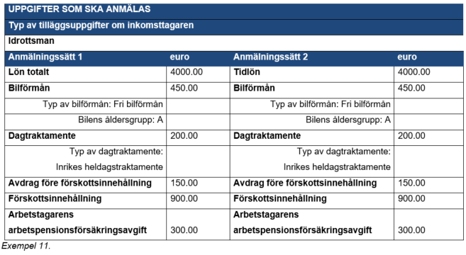Exempel 11: En lön på 4 000 euro har betalats till en idrottsman. Förutom penninglönen får idrottsmannen en fri bilförmån enligt åldersgrupp A till ett värde på 450 euro. Dagtraktamenten på 200 euro har betalats till idrottsmannen. Idrottsmannen har själv betalat 150 euro i omedelbara kostnader på grund av idrotten (arbetsredskap). Pensionsförsäkringsavgifter enligt lagen om olycksfalls- och pensionsskyddet för idrottsutövare har tagits ut av idrottsmannen till ett belopp på 300 euro.