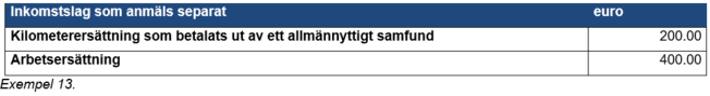 Exempel 12: Ett allmännyttigt samfund betalade enligt förhandsöverenskommelsen en skattefri kilometerersättning på 150 euro till en frivillig handledare för ledandet av sagogymnastikstunder. Därtill representerade handledaren samfundet vid ett förbundsmöte, och för denna resa betalade samfundet skattefritt ett heldagstraktamente och ett partiellt dagtraktamente (sammanlagt 45 euro) och därtill tågbiljetter och en hotellövernattning. Samfundet anmäler kilometerersättningen och dagtraktamentena till inkomstregistret. Resebiljetten för kollektivtrafiken och inkvarteringsersättningen anmäls inte.