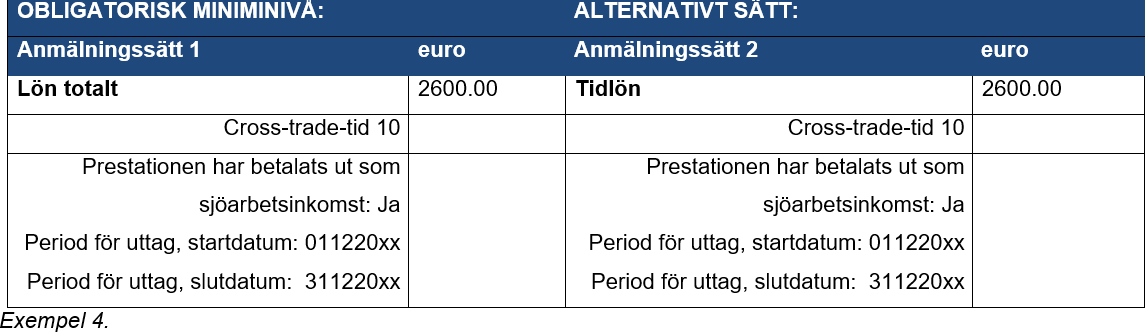Exempel 4: En arbetstagare arbetar på ett fartyg i december och januari. Sjöarbetsgivarens löneutbetalningsperiod är en kalendermånad, och lönen kan lyftas på den sista dagen i löneutbetalningsmånaden Arbetstagaren är till sjöss i december, varför lönen på 2 600 euro för december betalas till arbetstagarens konto först i januari. Eftersom inkomsten hade kunnat lyftas på den sista dagen i december, är den skattepliktig inkomst för det år då den varit uttagbar. Sjöarbetsgivaren antecknar startdatumet i december och året som startdatum för perioden för uttag och slutdatumet i december och året som slutdatum. I anmälan om löneuppgifter anmäls också information om att arbetstagaren har rätt att få ett cross-trade-avdrag för mars–december.