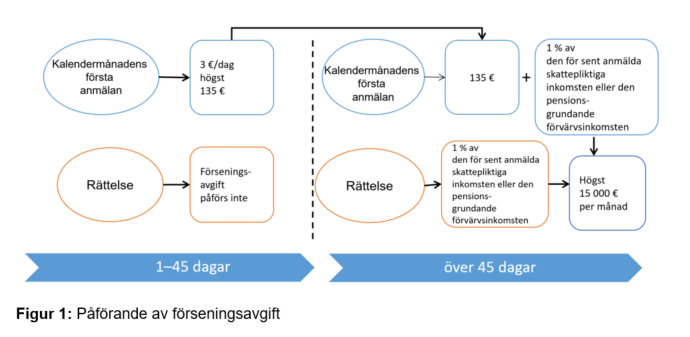 Om den första anmälan för betalningsperioden försenas med över 45 dagar, uppgår den dagsspecifika delen av förseningsavgiften till 135 euro. Till den dagsspecifika delen görs ett tillägg på 1 procent av beloppet på den skattepliktiga prestation som anmälts för sent eller beloppet på det förvärvsinkomst som ligger till grund för den pension vilken anmälts för sent.