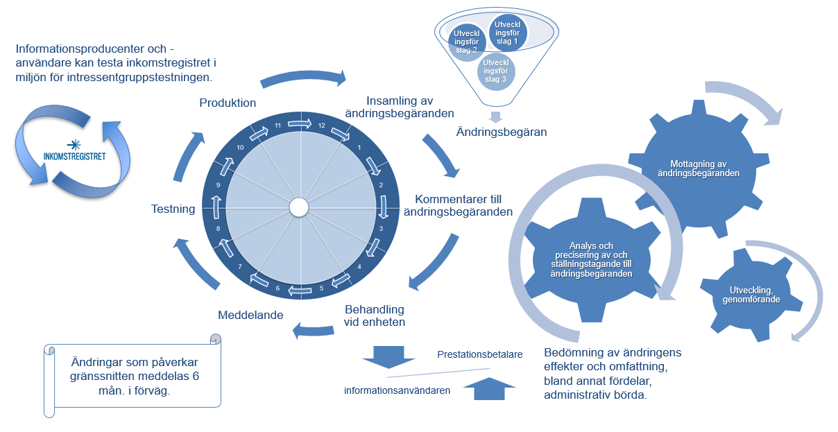 Den småskaliga utvecklingen framskrider enligt årsklockan. I december sammanställs alla ändringsbegäranden. Under början av året bedömer inkomstregistret genomförbarheten av begärandena och dess genomslag och ber vid behov om ställningstaganden av intressentgrupperna om ämnet. Därefter väljer inkomstregistret de ändringsbegäranden som ska genomföras, inleder genomförandet av förändringarna och ger information om förändringarna till de kunder som påverkas av förändringen. Innan förändringarna överförs till produktionen har informationsanmälarna och informationsanvändarna möjlighet att testa nya funktionaliteter i inkomstregistrets testmiljö.