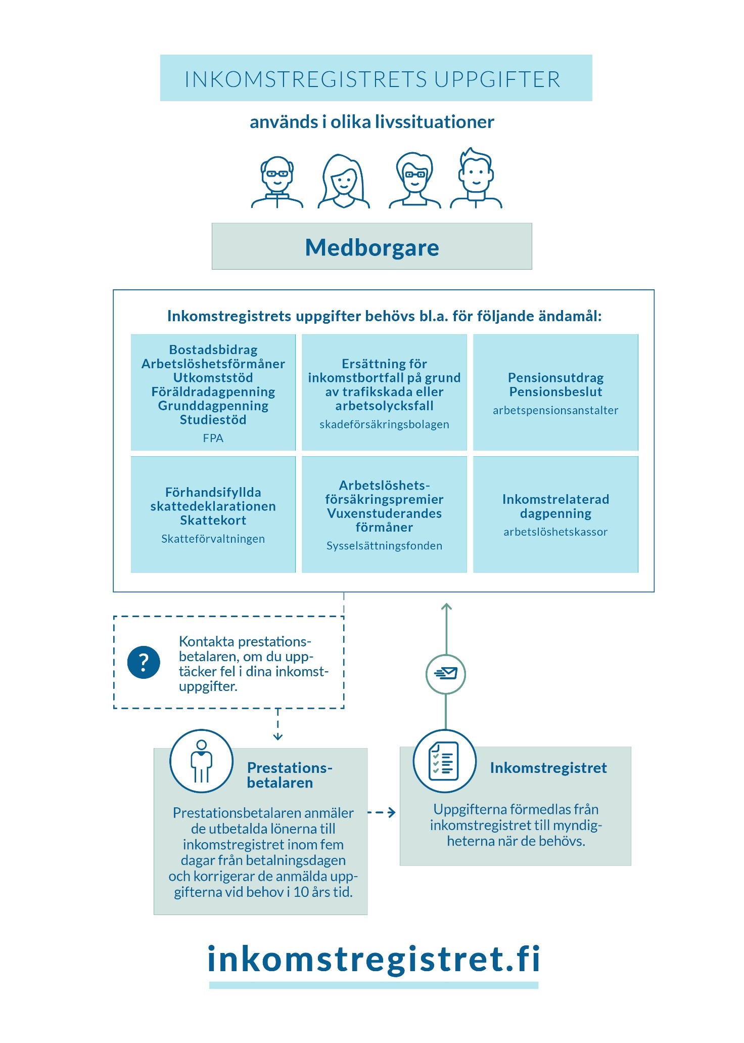 Skatteförvaltningen använder uppgifter från inkomstregistret i förhandsifyllda skattedeklarationer och ändringsskattekort. FPA behöver uppgifterna för att bevilja förmåner och dagpenningar till arbetsgivare.