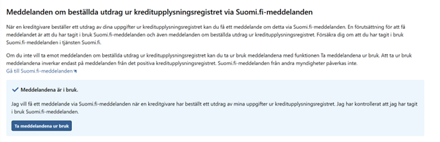 Om du inte vill få meddelanden kan du ändra på meddelandeinställningarna i det positiva kreditupplysningsregistrets e-tjänst. Inställningarna finns i punkten Meddelanden om beställda utdrag ur kreditupplysningsregistret via Suomi.fi-meddelanden på sidan Utdrag ur kreditupplysningsregistret.
