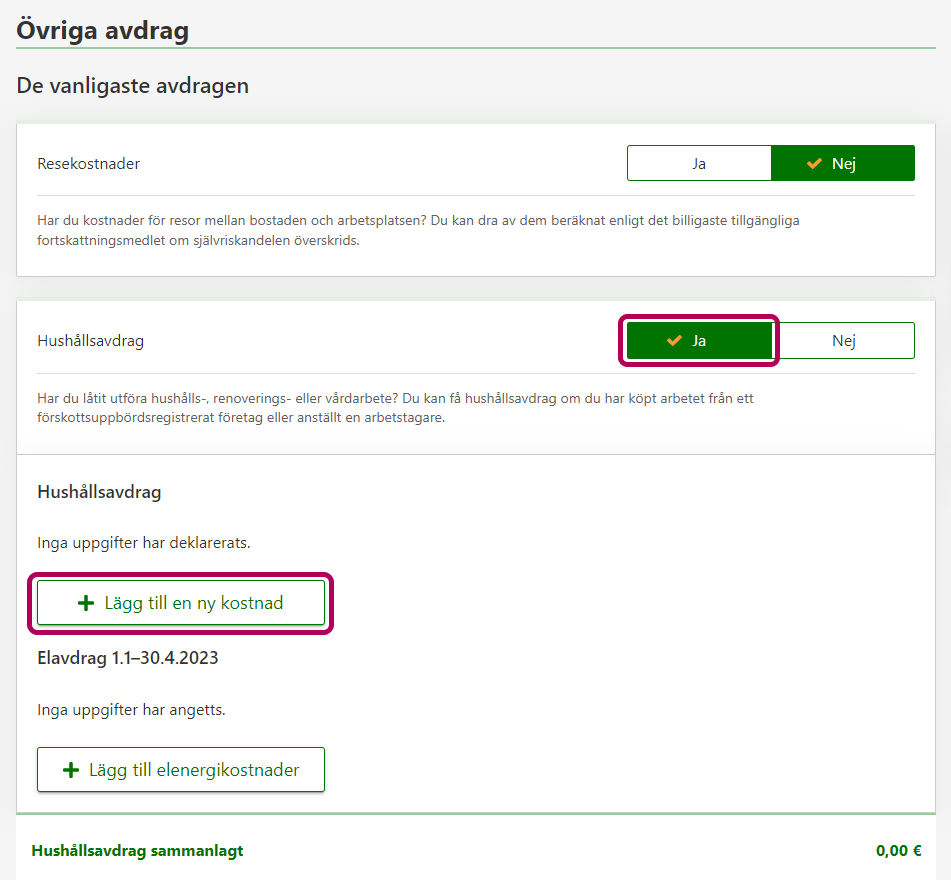 I annat fall ska du gå till fasen Övriga avdrag. Välj först Ja i punkten Hushållsavdrag och därefter knappen Lägg till en ny kostnad.