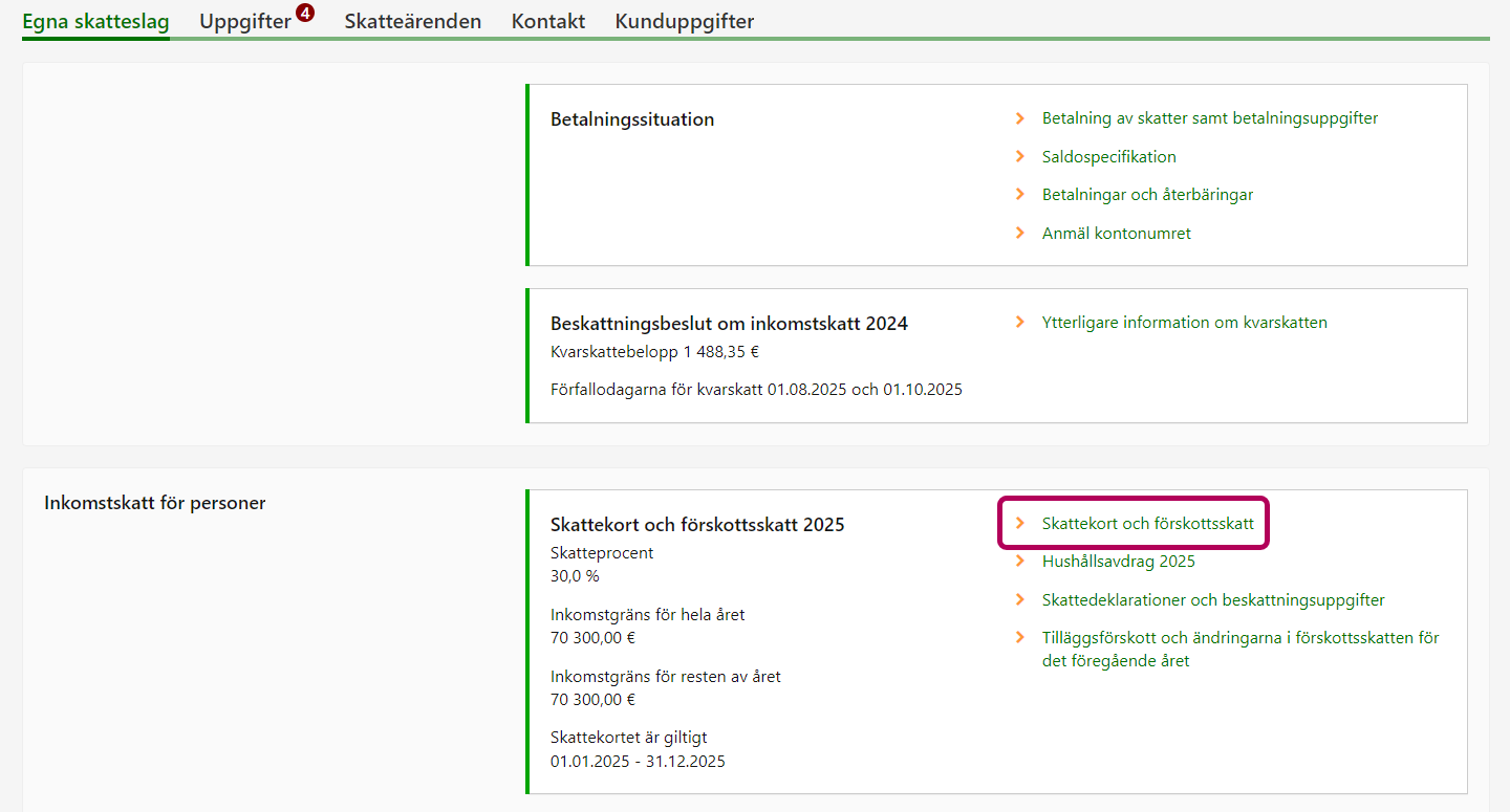 Om du har lämnat uppgiften om hushållsavdrag tidigare, till exempel i din ansökan om skattekort eller förskottsskatt, visas den i fasen Förhandsifyllda inkomster och avdrag. Korrigera uppgifter i den här fasen. Uppgifterna visas förhandsifyllda också om du har kommit överens om att företaget som utförde arbetet anmäler uppgifterna för dig.